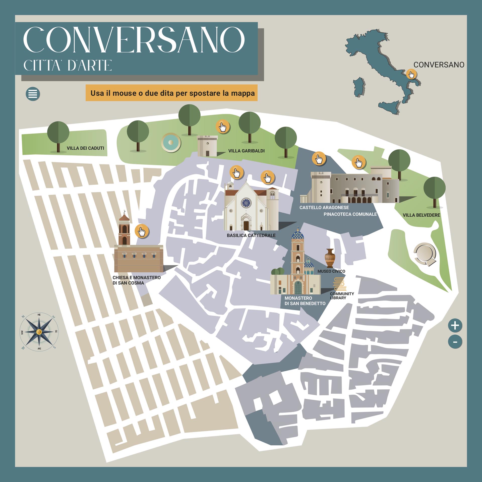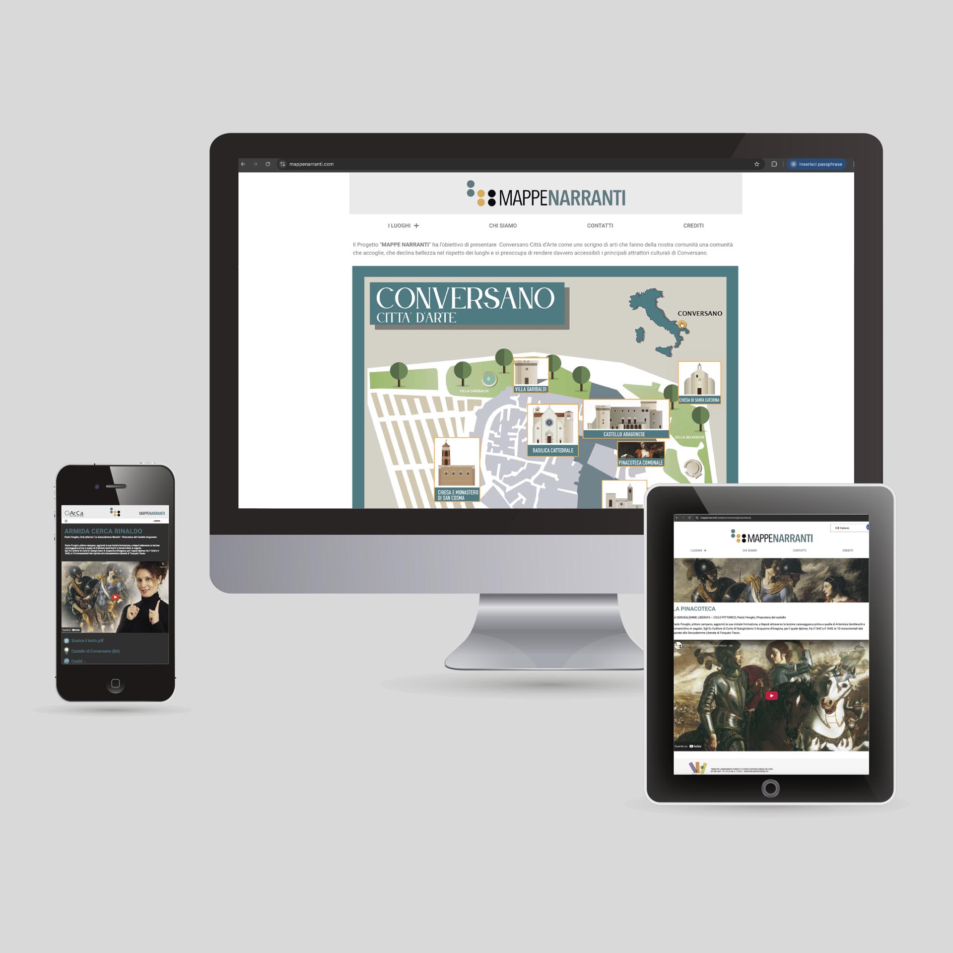 Progetto per la mappatura di punti di interesse nel Centro storico di Conversano, elaborazione di schede tematiche che illustrano le caratteristiche storico-architettoniche dei monumenti e luoghi di cultura. Le schede sono state inserite su sito web dedicato e, attraverso QR-Code apposti su totem dinanzi ad ogni punto di interesse, è possibile consultarne le relative mappe narranti.